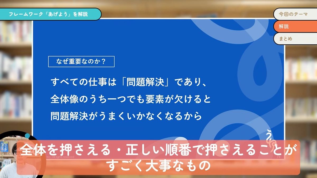 なぜこれが重要かというと、我々のすべての仕事というのは「問題解決」なんですね。問題解決という全体像があります。その全体像のうち、1個でも要素が欠けるとうまくいかなくなるので、「あげよう」というフレームワークで全体をちゃんと正しい順番で押さえることがすごく大事なことになります。