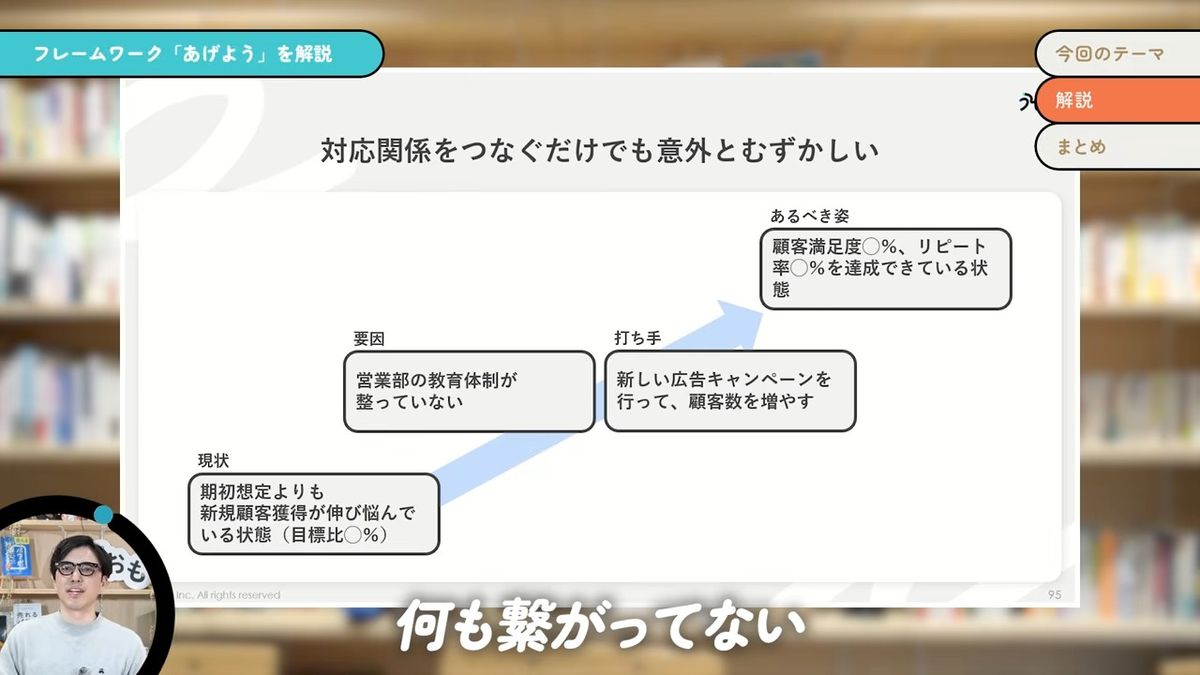 意味がわからないのがわかりますかね? あるべき姿で「顧客満足度・リピート」という話をしているのに、現状は「新規」の話をしていて、要因は「教育体制」と言っているのに、打ち手は「広告キャンペーン」で、何もつながっとらんやんけと。