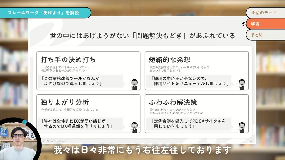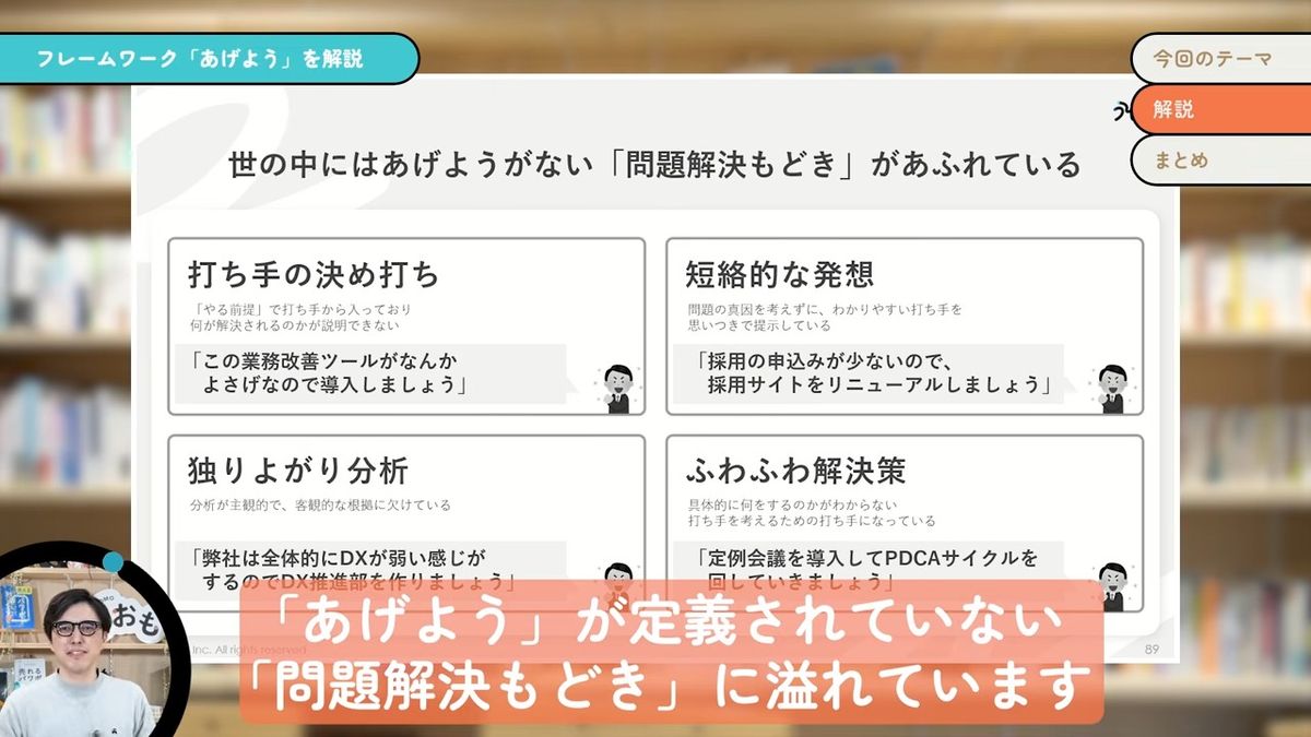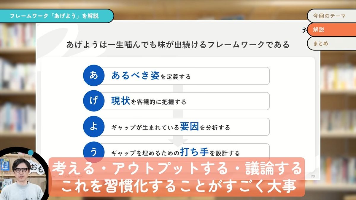 まずは「あげよう」というフレームワークが頭の中にあるということがすごく大事なので、この動画を見た今日から、仕事をする時に「今、俺のこの仕事の『あげよう』は何だっけ?」ということを考える・アウトプットする・議論する。これを習慣化することがすごく大事なので、ぜひ「あげよう」を使ってみてください。
