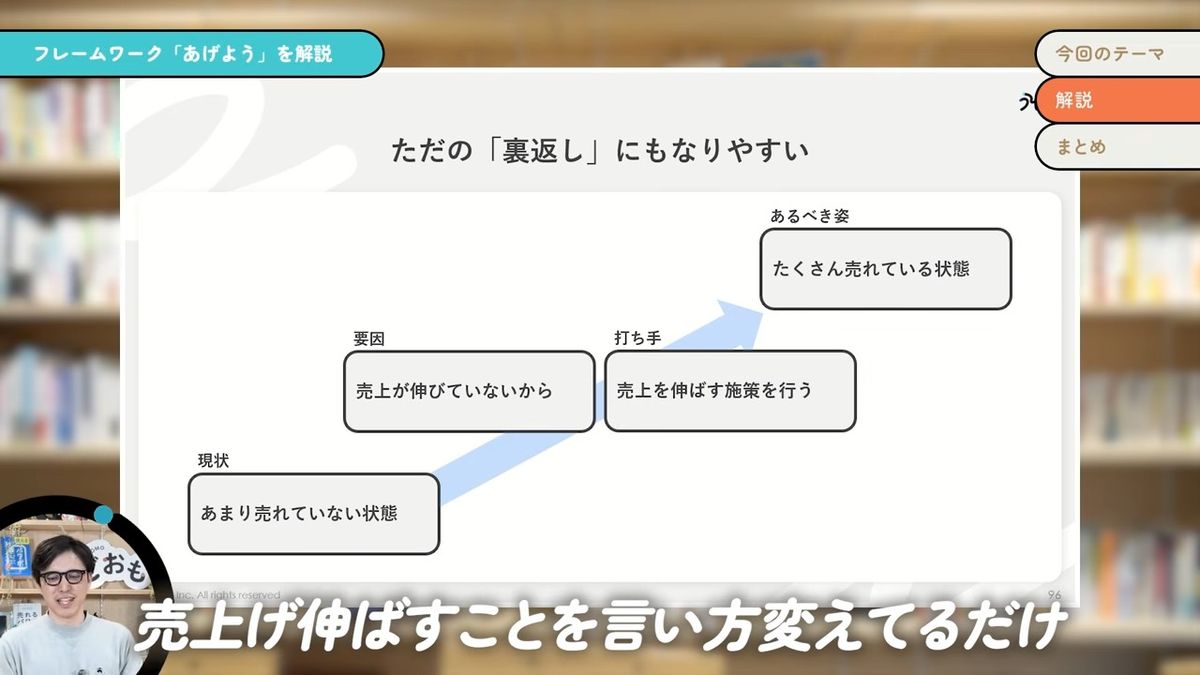 他にもけっこうありがちなのが、ただの裏返し。「たくさん売れている状態にしたいです。現状はあまり売れていないです。要因は、売上が伸びていないからです。だから、打ち手は売上を伸ばします」「何も言っていないね。売上を伸ばすことを、言い方を変えているだけじゃないか」となったり。