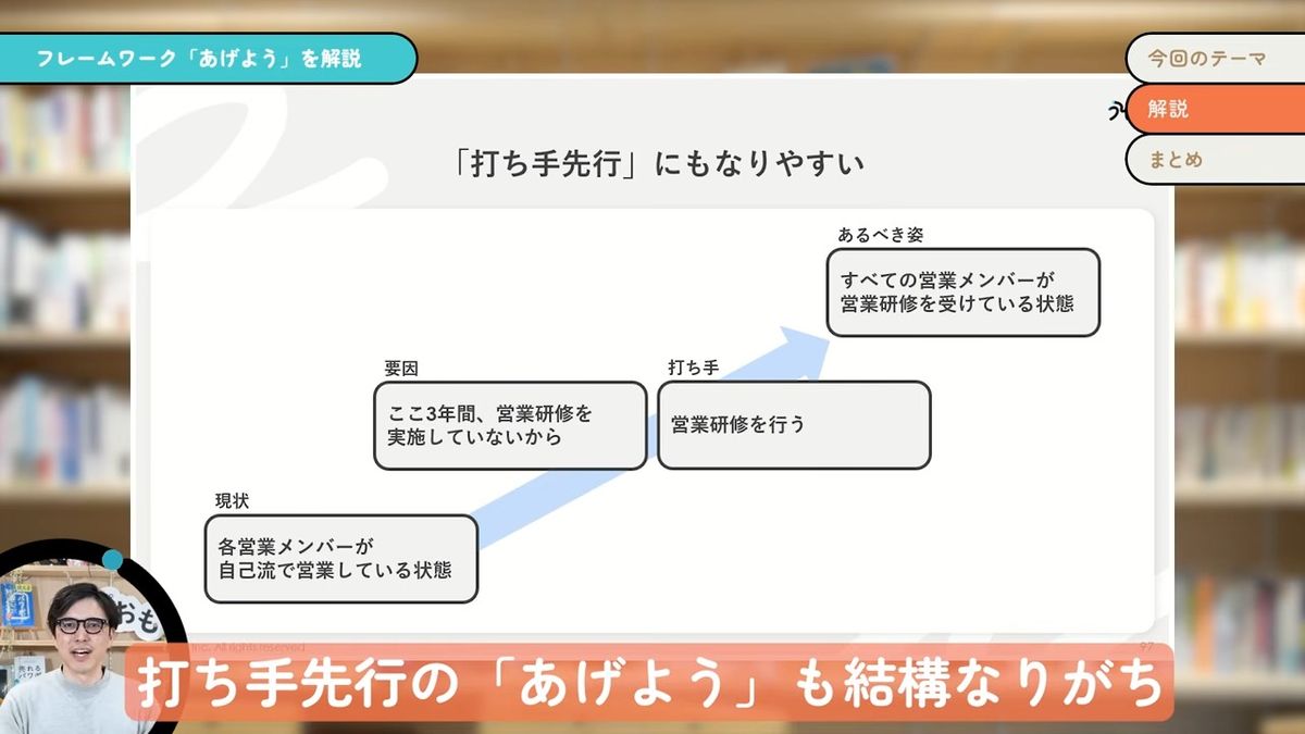 打ち手先行。「すべての営業メンバーが営業研修を受けている状態にしたいんです。現状は各営業メンバーが自己流で営業をしています。要因はここ3年間、営業研修を実施していないからです。だから、営業研修をやります」「いや、お前それ、営業研修をやるってことが先に決まっていて、やる前提で考えているだろう」といったような、打ち手先行の「あげよう」もけっこうありがちです。