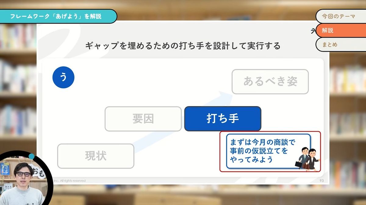 「じゃあまずは、今月の商談で事前の仮説立てを15分でも取る。これを必ずやってみよう」というふうに打ち手を設計して実行するという流れを取るべきなわけです。この例もけっこうざっくりです。