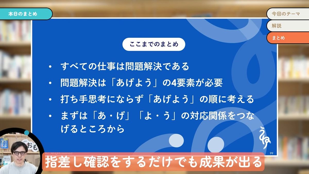 まとめます。我々がやるすべての仕事は、問題解決です。問題解決をちゃんとするためには、「あげよう(あるべき姿・現状・要因・打ち手)」の4要素が必要になります。我々はついつい打ち手思考、目で見える打ち手に気を取られてしまうので、必ずあるべき姿から「あ・げ・よ・う」の順番に考えて、打ち手は最後にしましょうということですね。