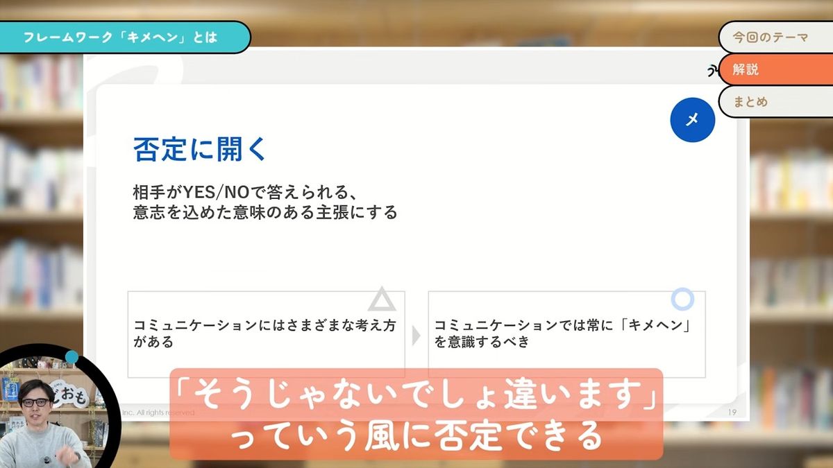 一方で、これを「コミュニケーションでは常に『キメヘン』を意識するべきなんです」というふうに言うと、「いやいや、キメヘン? ほんまか? 『常に』って言いすぎじゃない? そうじゃないでしょう。違います」と否定できるじゃないですか。これが「否定に開かれている」という状態です。