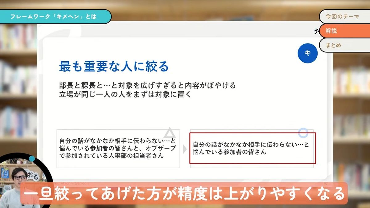 例えば研修だとしたら、「自分の話がなかなか相手に伝わらない」と悩んでいる参加者のみなさんと、オブザーブで参加されている人事部の担当者さん。両方を定義すると話が変わっちゃうので、「いったん今は研修参加者のみなさんにフォーカスをします」というふうに絞ってあげたほうが、精度は上がりやすくなります。