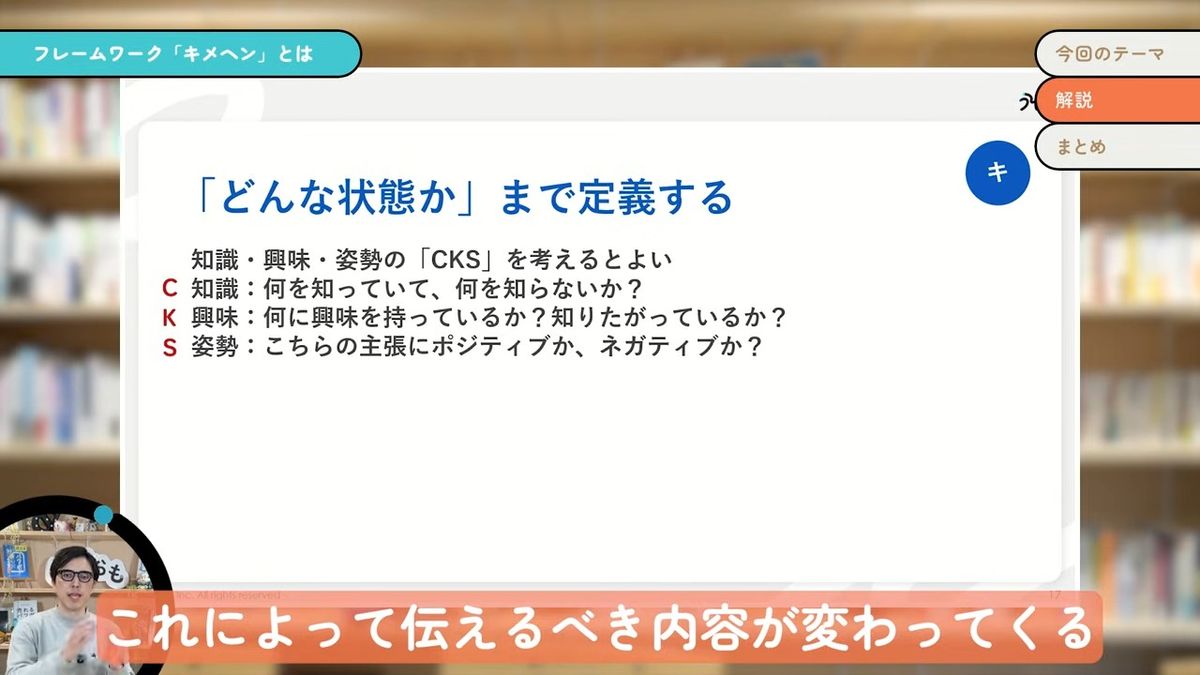 1個目が「聴き手」の話です。「どんな状態か」まで定義するということですね。知識・興味・姿勢の「CKS」を考えるといいです。