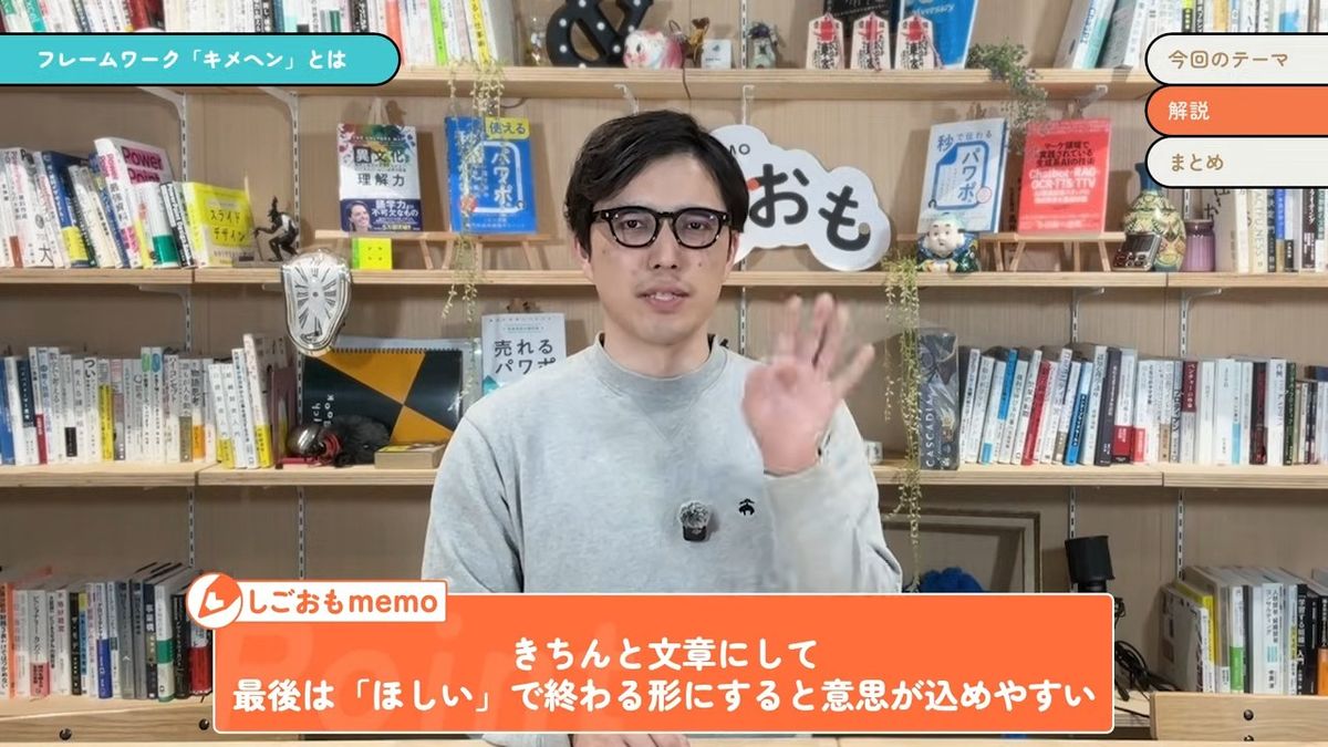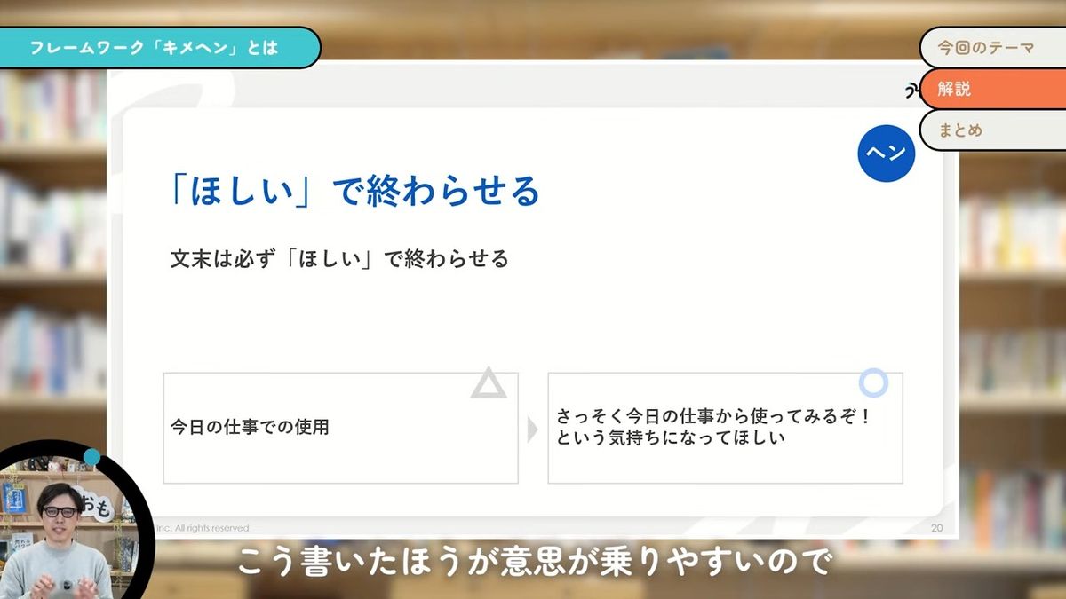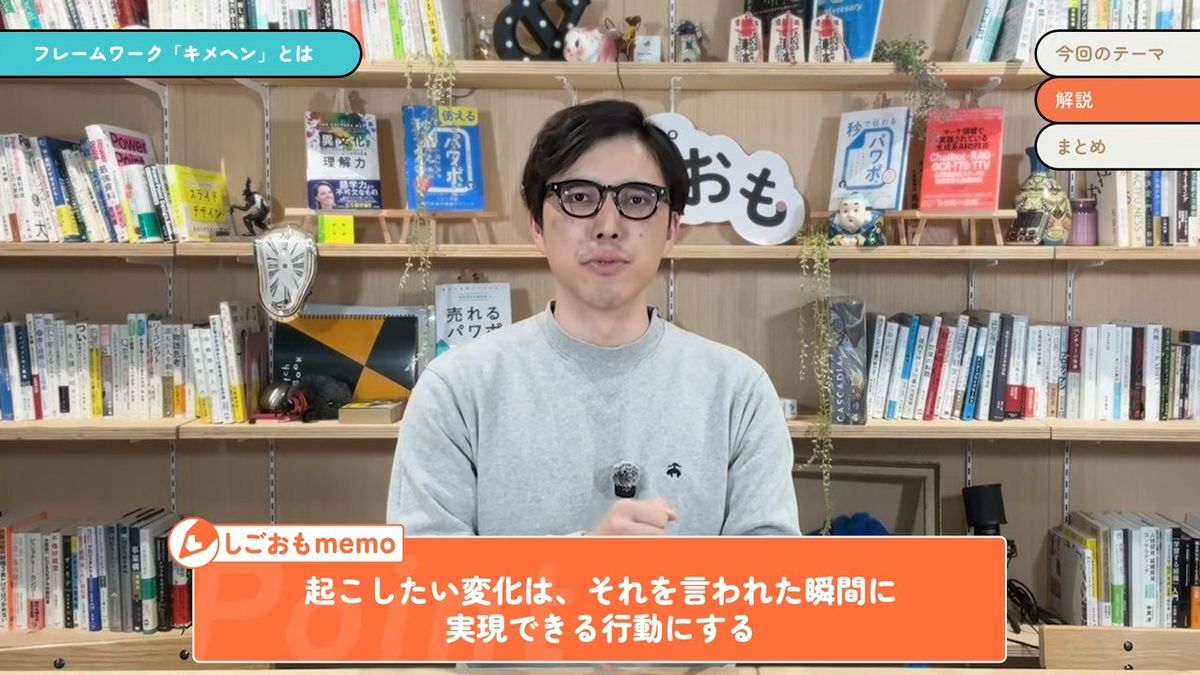 例えばですけど、「最終報告プレゼンで『キメヘン』を使ってみてほしい」。これ、願望としてはいいんですよ。視聴者のみなさんが、何かの仕事の報告プレゼンで「キメヘン」を使う。これはやってほしいわけですよ。でもこれって、この動画を見たその瞬間には物理的に絶対できないじゃないですか。今はプレゼンを作ってないから。