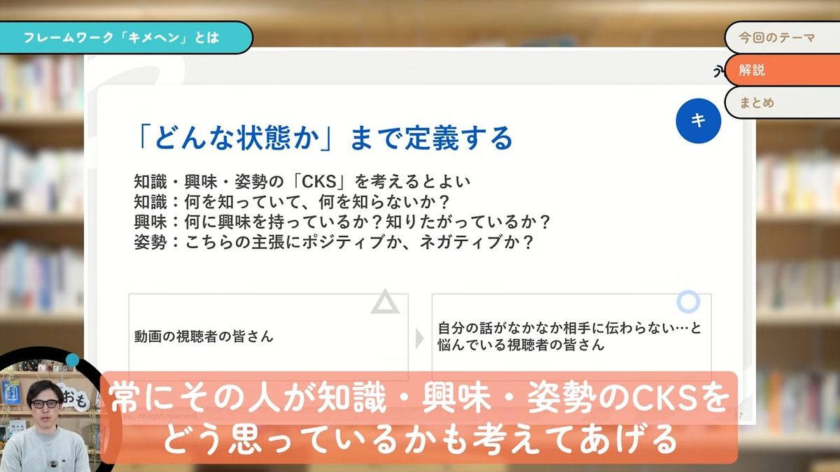「『自分の話がなかなか相手に伝わらないな』と悩んでいる視聴者のみなさん」という要素を足してあげると、解像度が上がって、この後の「メ」と「ヘン」が考えやすくなります。その人が知識・興味・姿勢のCKSをどう思っているかというところも常に考えてあげると、思考が深まりやすいのでオススメです。