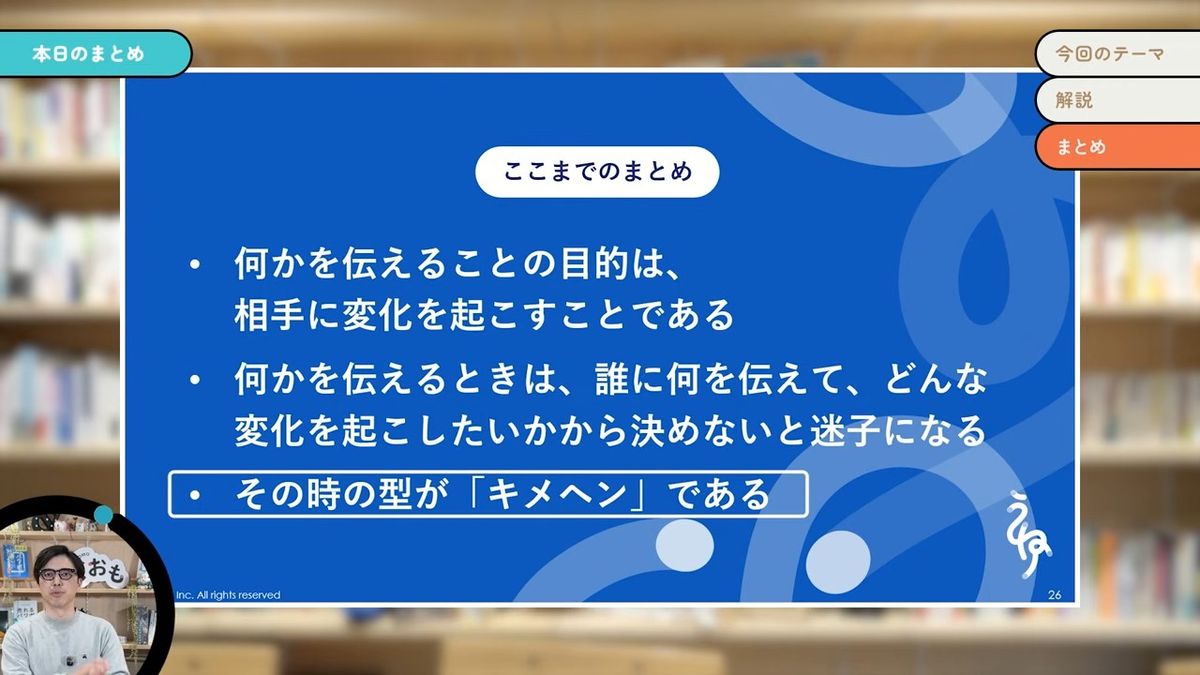 まとめます。何かを伝えることの目的というのは、相手に変化を起こすことなんですね。伝えることはあくまで手段です。伝える内容に気を取られがちだけども、そうじゃなくて、「誰に何を伝えて、どんな変化を起こしたいのか・起こしてほしいのか」をちゃんと定義しておかないと迷子になる。自分でも何が言いたいかわからなくなるから、ちゃんと言語化しましょう。その時の型が「キメヘン」です。