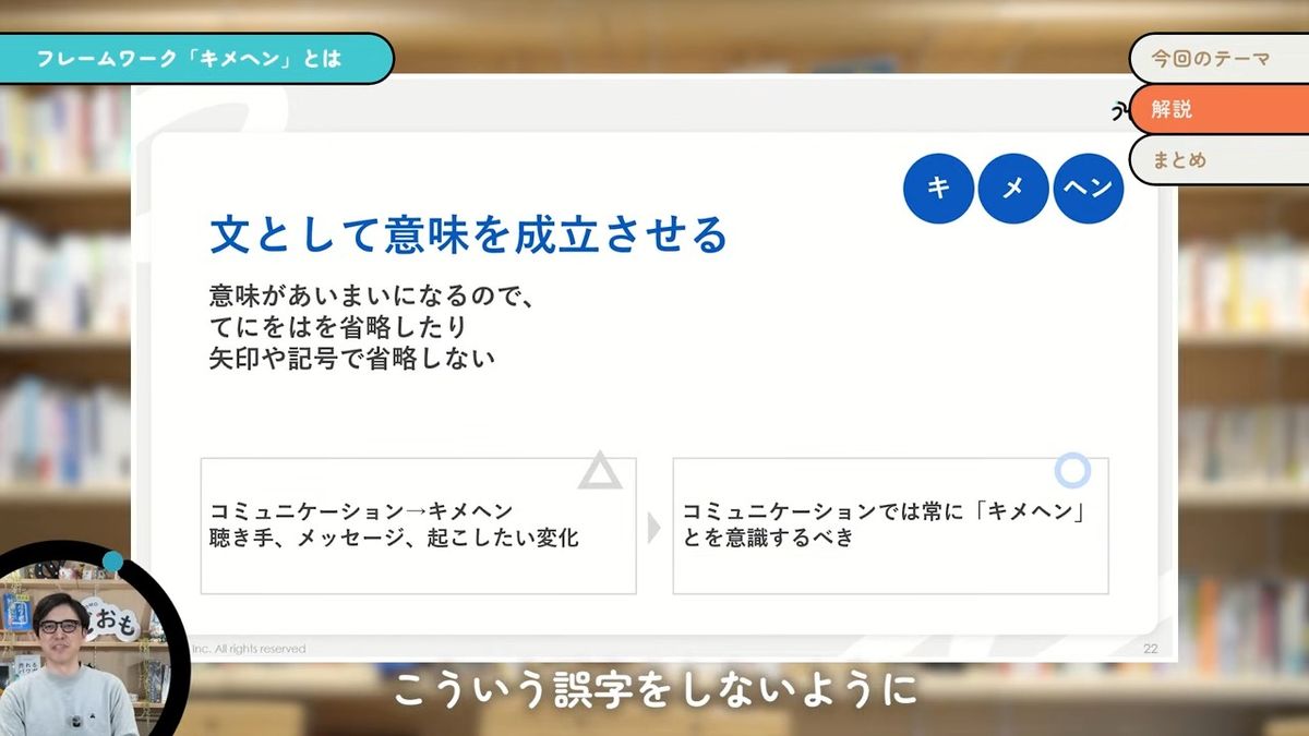 「コミュニケーションでは常に『キメヘン』を意識するべき」。これは意味が通じていますよね。(画面を示して)誤字っていますけども、こういう誤字をしないように、ちゃんと日本語にこだわりましょうということです。
