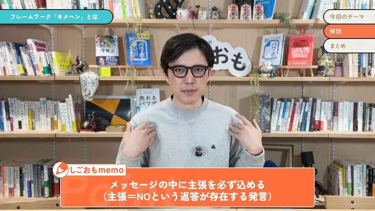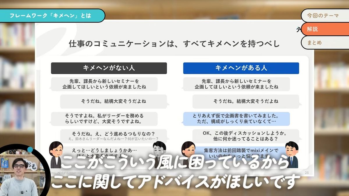 ここまでプレゼン資料っぽい話をしてきたんですけども、仕事のコミュニケーション。雑談なら(気にしなくて)いいですけれども、ビジネス上のコミュニケーションは、全部必ず「キメヘン」を持ってください。