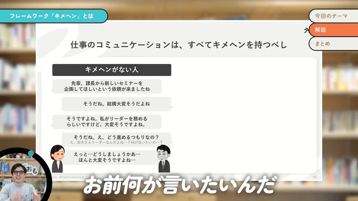 「キメヘン」がないコミュニケーションって、相手にめちゃくちゃ負荷をかけるんですね。例えば、「先輩、課長から新しいセミナーを企画してほしいという依頼が来ましたね」「そうだね。けっこう大変そうだよね」「私がリーダーを務めるらしいですけど、大変そうですよね」「そうだね。どう進めるつもりなの?」「どうしましょうかぁ。ほんと大変そうですよね」「ふざけんな。お前は何が言いたいんだ」と。