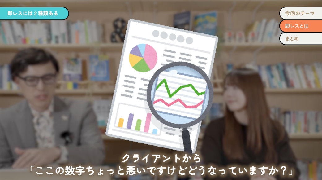 豊間根:あるいは、あとは例えば、広告のね、運用をしている代理店の人がクライアントから、「なんかここの数字、ちょっと悪いですけど、どうなっていますか?」って連絡が来た時に、「確認します」って1分で返す。