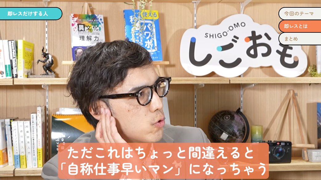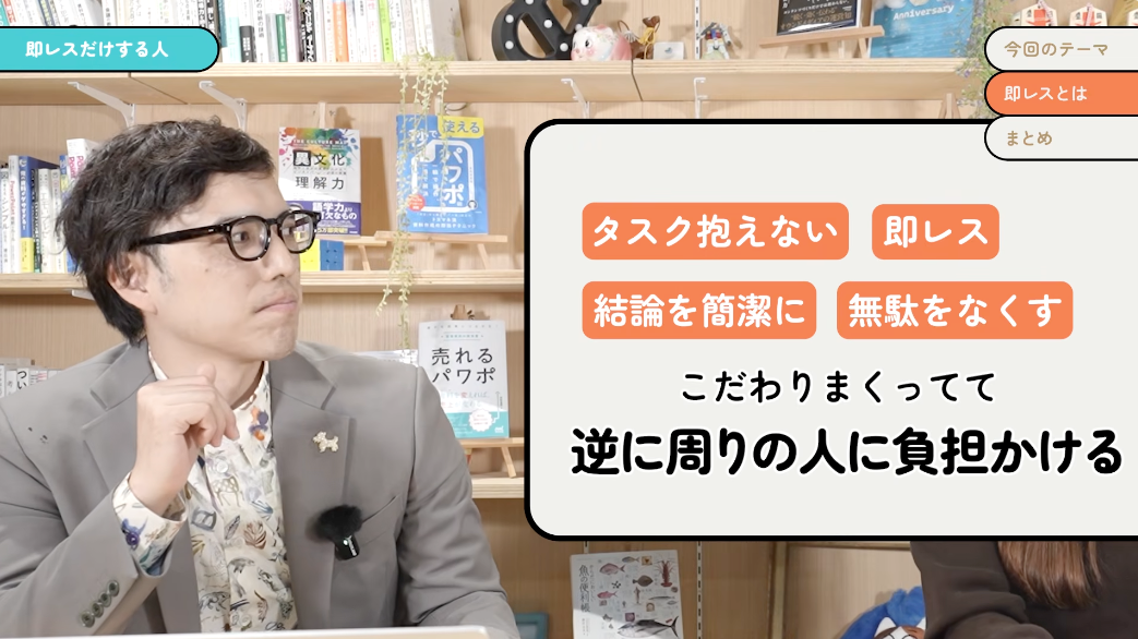 豊間根:「タスクを抱えない」「即レス」「結論を簡潔に」「無駄をなくす」みたいなことにこだわりまくっていて、逆に周りの人に負担をかけちゃうみたいな。その人は効率化しているけど、他の人がフォローするのに周りの人が時間がかかっているみたいなことにけっこうね、即レスを極めようとし過ぎるとなっている場合があるなと思っていて。