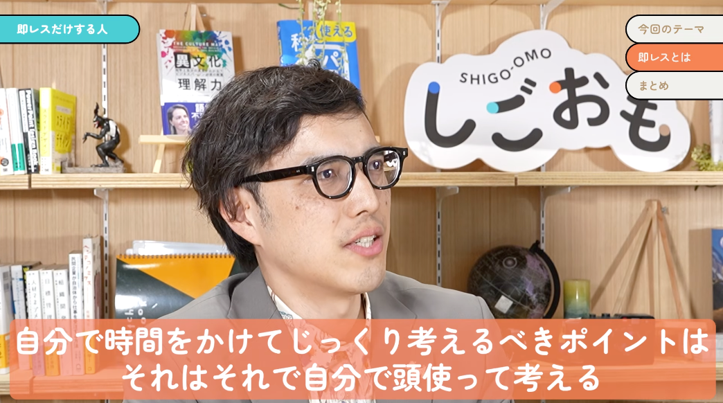 豊間根:というふうに、「その内容を受け取ったよ」っていう事実だけを返す場合と、その何か依頼とか問いかけに対して、その人が気にしている論点を見つけて、そこに対して答える自分なりの仮説をぶつける即レスっていうのは、これ、ぜんぜん違うと思っているんですよ。