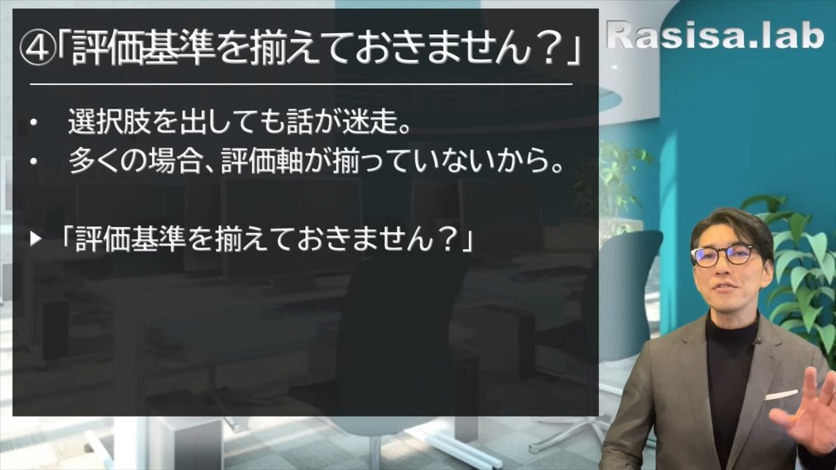 さあ、では4つ目の質問にいきましょう。ドン。(意見の)対立が起こった時(のための質問です)。複数の案を出しても対立は起こります。その場合に「評価基準を揃えておきませんか?」と言えるかどうかです。これはめちゃくちゃ頭が良いと思われます。