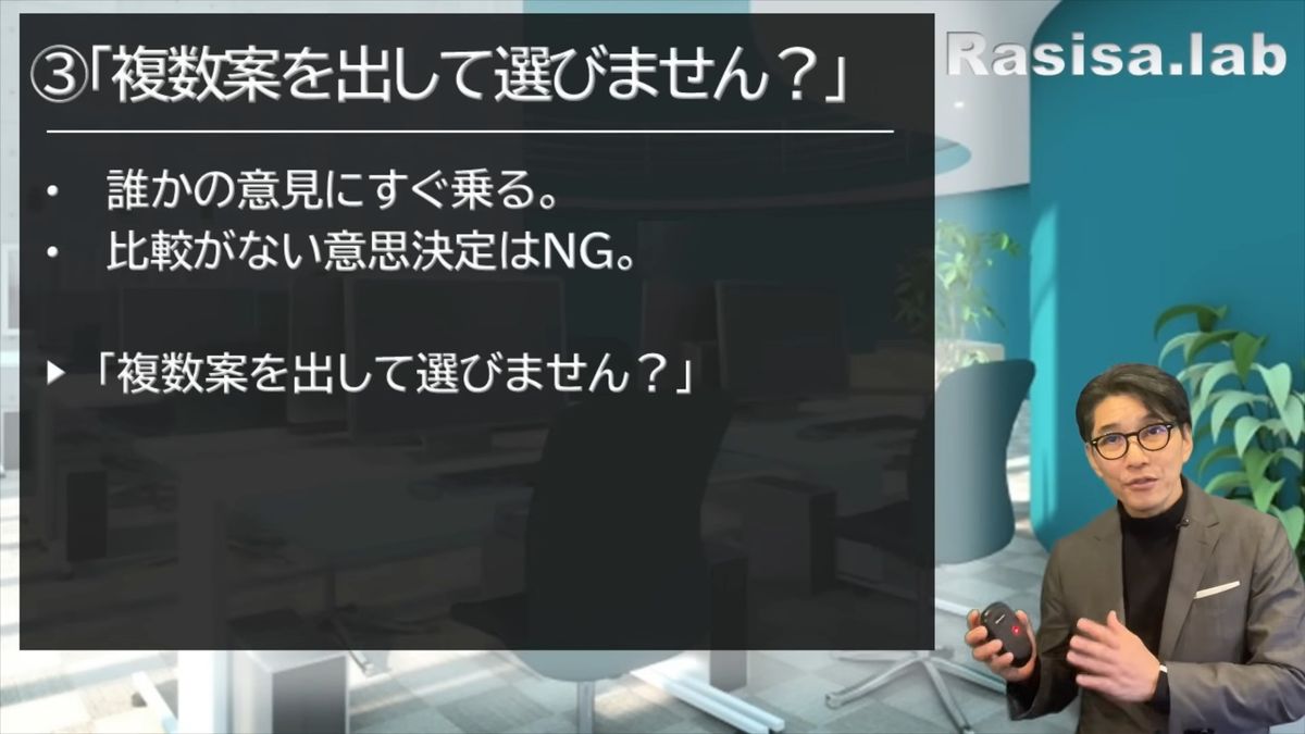 どうでしょうか。邪魔くさがっていませんか? 邪魔くさがらず、複数案から選ぶ。ぜひ、これをやってみてください。「あ、この人は冷静だな」と思われると思います。