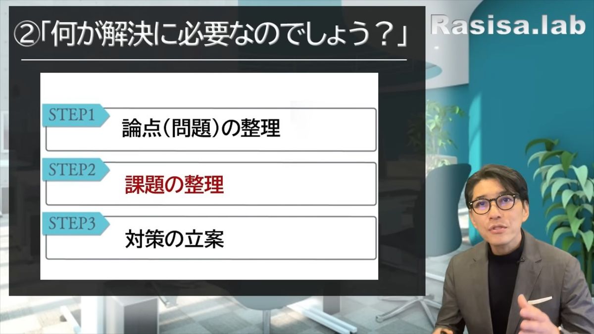 (スライドを示して)こちらは私のロジカルシンキングの講座でも紹介しておりますが、問題解決のステップです。ステップ1は論点。さっき、「論点を整理しませんか?」ということを言いました。「論点や問題を整理しておきませんか?」がステップ1です。