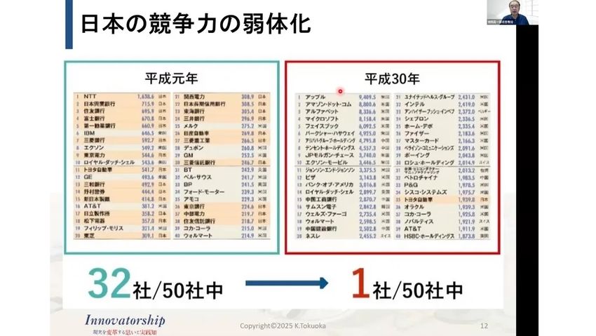 これは有名な表ですけども、平成は失われた30年と言われています。グローバルの時価総額で見た場合、平成元年には50社中32社が日本企業だったんですけども、30年経ったら1社だけになってしまいました。この後どんなイノベーションを起こしていかないといけないか。どんな力があるんだろうか。