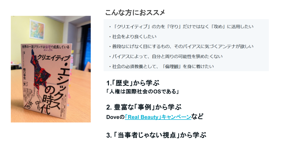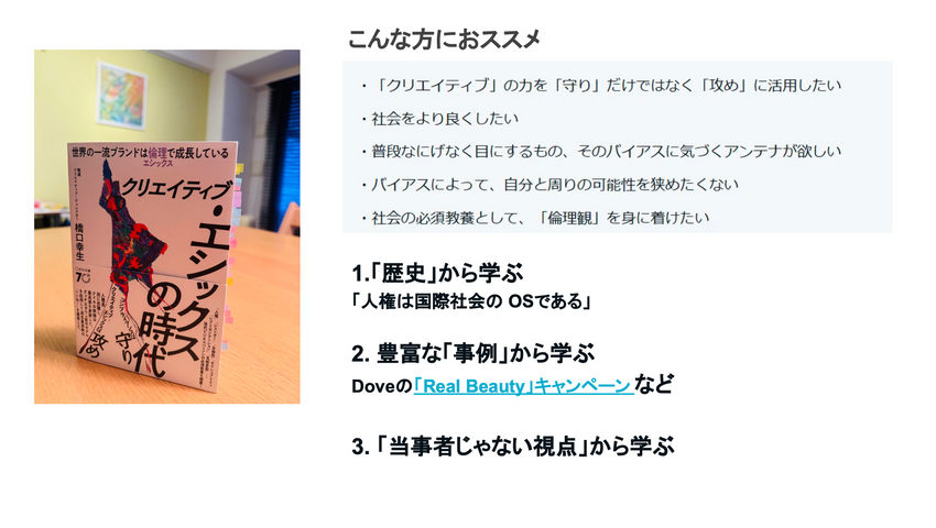 最近は「炎上しないために」みたいな、守りの視点がけっこう色濃く出ていると思うんですけれども、攻めに活用していくための本だと思いました。社会をより良くしていく視点でクリエイティブの力を使っていったり、倫理観を必須教養として身につけていくことが大事だなと思っております。