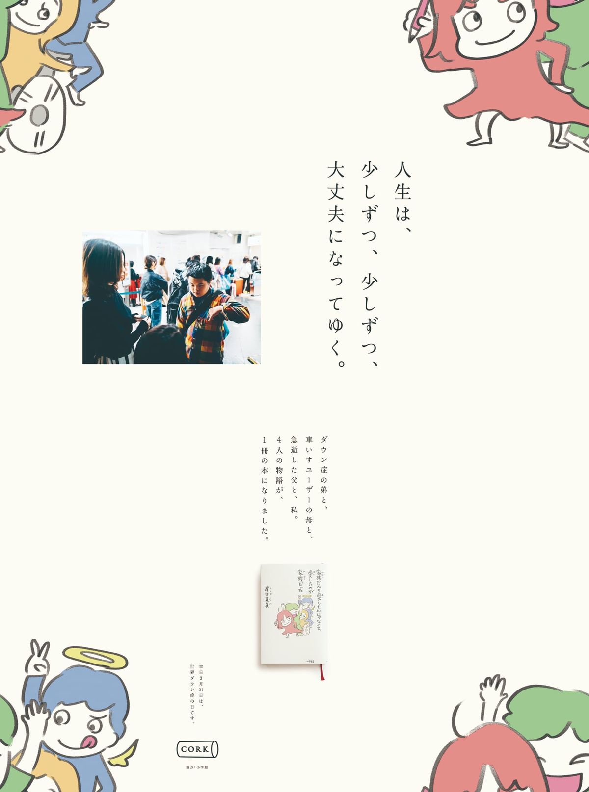 その他の事例だと、岸田奈美さんの本の広告で、「世界ダウン症の日」の新聞広告をつくりました。この前(2025年3月21日)、世界ダウン症の日にヘラルボニーの新聞広告が出ていましたけれども、これは3年ぐらい前にやったものですね(2021年の事例)。