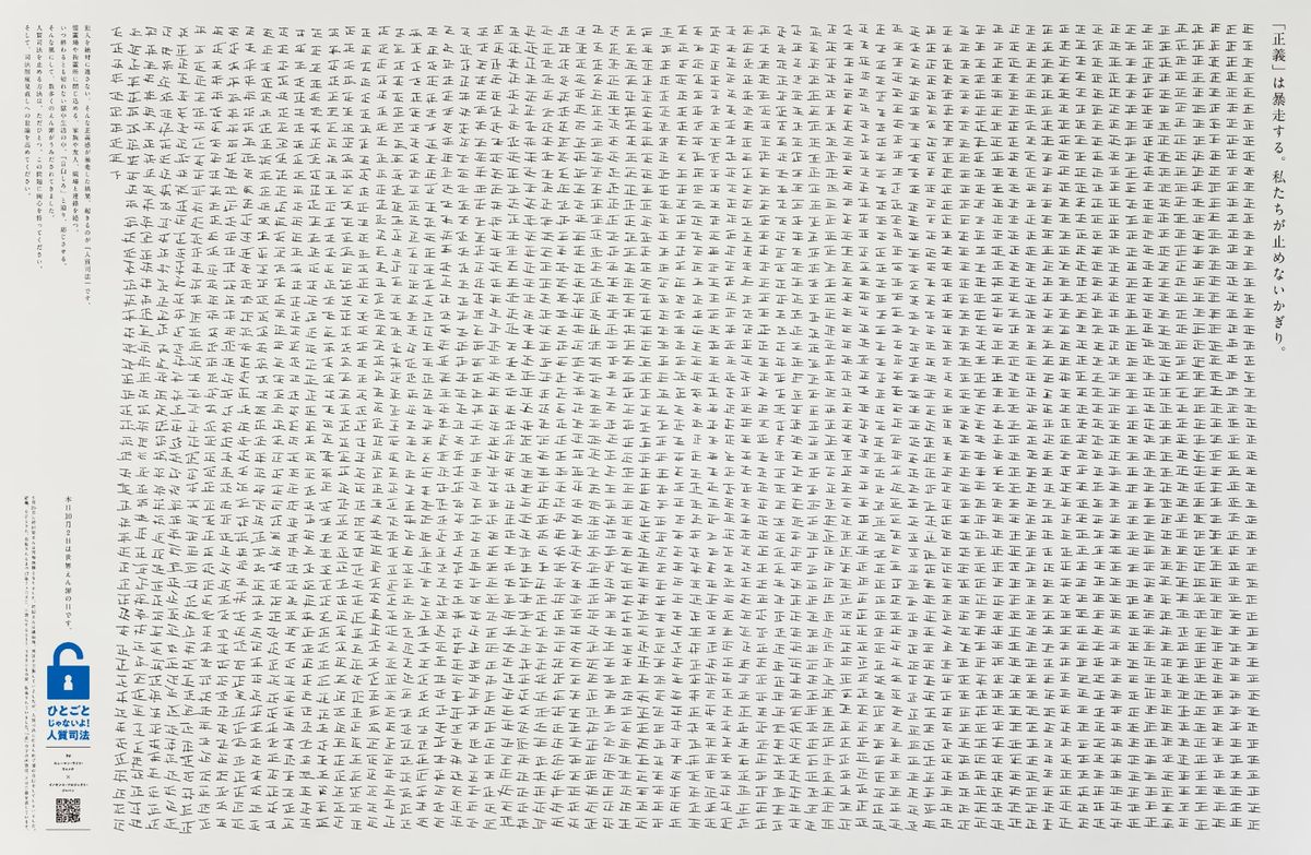 橋口:小さいから本文が読めないですね。これ、実際は新聞の30段(見開きの全面)なので相当に大きいものなんですけれども、キャッチフレーズは、「『正義』は暴走する。私たちが止めないかぎり。」なんですよ。