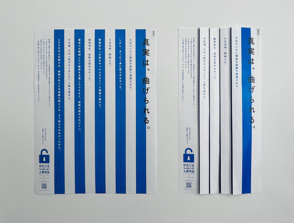 ここ2年間は、「世界えん罪の日」の仕事もしています。毎年10月2日って「世界えん罪の日」になっていて、世界中で冤罪への意識を高めるための啓蒙活動が行われるのですが、それの一環として2023年、2024年に作った新聞広告です。