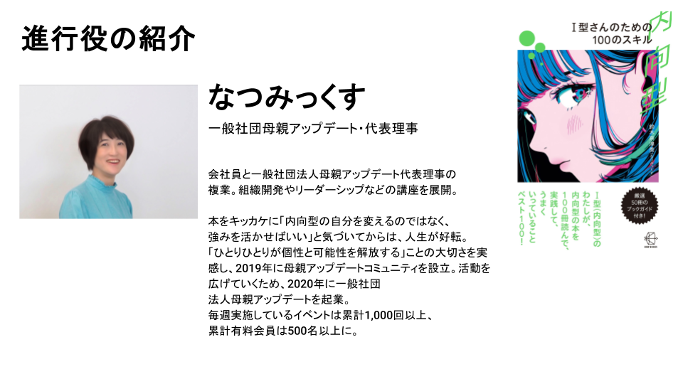 なつみっくす氏(以下、なつみっくす):あらためまして、なつみっくすと申します。今回のイベントを主催しております、母親アップデートコミュニティの発起人で、団体の運営をしております。前から橋口さんの書籍を拝読しておりまして、ずっとSNSをフォローしていました。