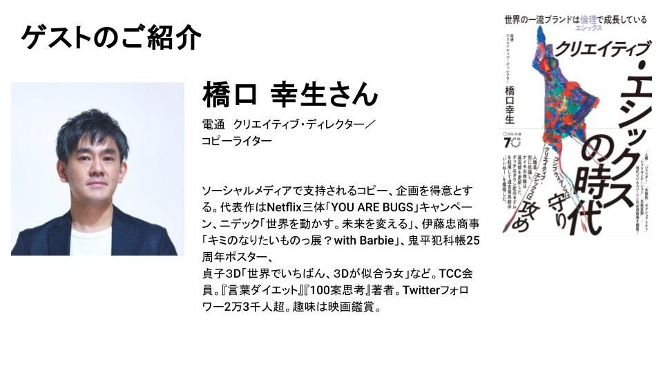 橋口:はい。みなさん初めまして、橋口と申します。ふだんは電通という会社で広告のクリエイティブ・ディレクター、コピーライターをやっています。ニデックやネットフリックスといったクライアントを担当しています。