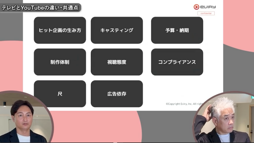 西田:まぁ、でも単純に、タレントさん的には、いろんな出演機会があって、より自分がこだわっているところと、そのチャンネル、動画で出るものがヒットするんやったら、めちゃくちゃいいんじゃないですか? テレビでは伝えられないことも伝えられるし。だから、どんどん染まっていくのはいいんとちゃうと思いますけどね。より深く愛してもらえるわけやし。