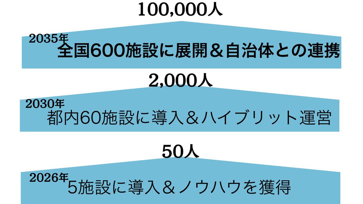 実際にハツトライ応援団1期生(の募集)を7月に開始します。そこから2026年までに5施設に導入、ノウハウを獲得し、まずは50人にハツトライを届ける。そして2030年に60施設に導入、オンラインも活用してハイブリッドに運営します。