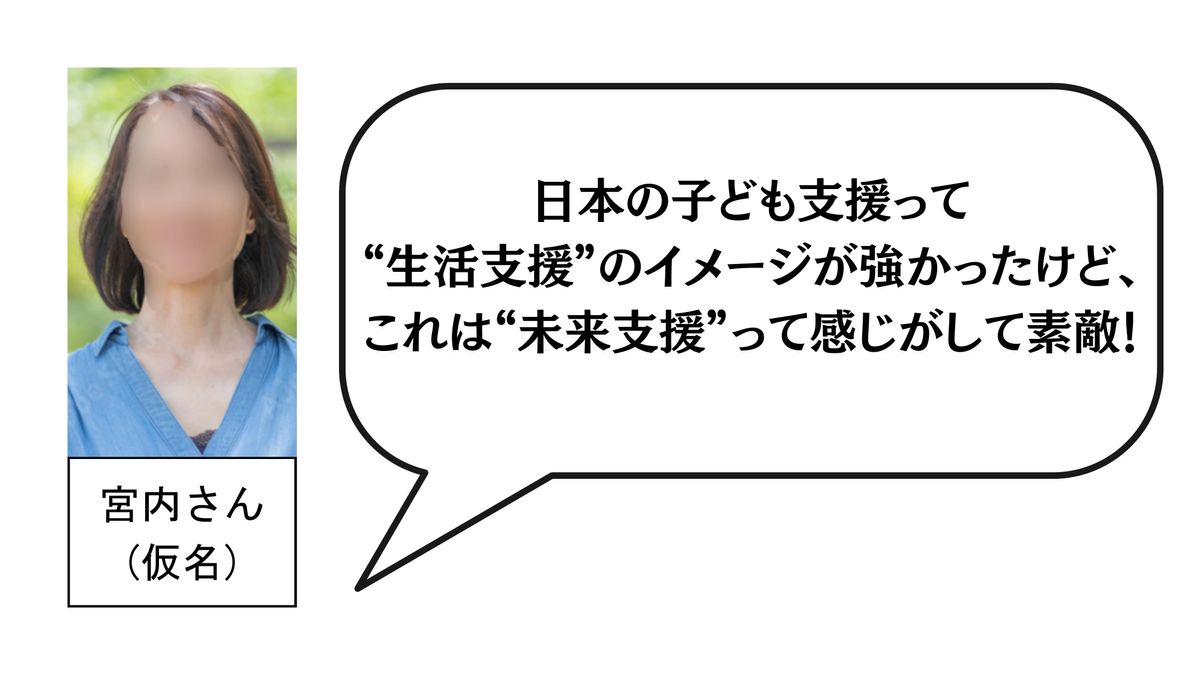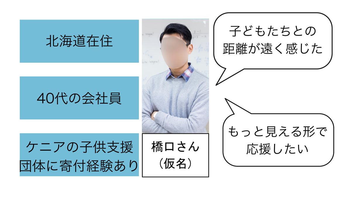 「時間はないけど、子どもの役に立ちたい」「子どもとのつながりを持ちたい」。「子どもたちとの距離が遠く感じた」。彼はアフリカのケニアの子ども支援団体に寄付経験があったけど、やめてしまった人です。「もっと見える形で応援したいんだよ」。彼らが欲しているのは手触り感、繋がり、透明性。