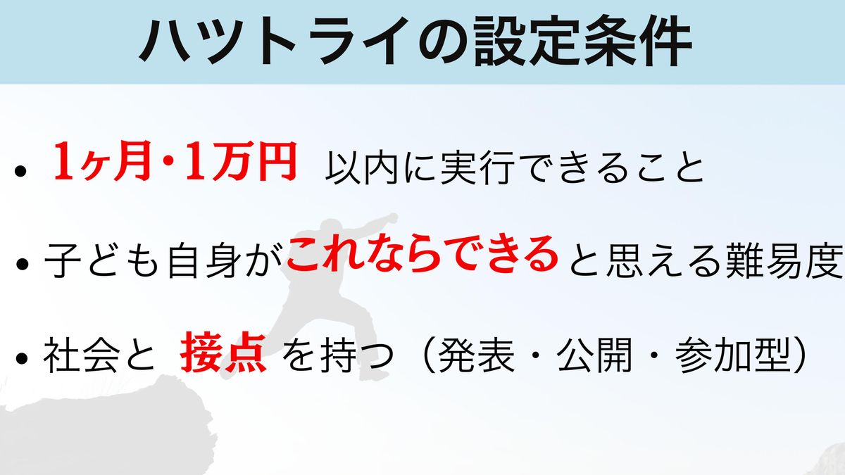 1ヶ月目、遊びを通して信頼関係を作ります。やってみたいことを一緒に考えます。6つのパターンを考えます。「ハツトライの設定条件」に合うように落とし込んでいきます。1ヶ月、1万円以内で実行できること、子ども自身が「これならできる」と思うこと、社会と接点を持つこと。