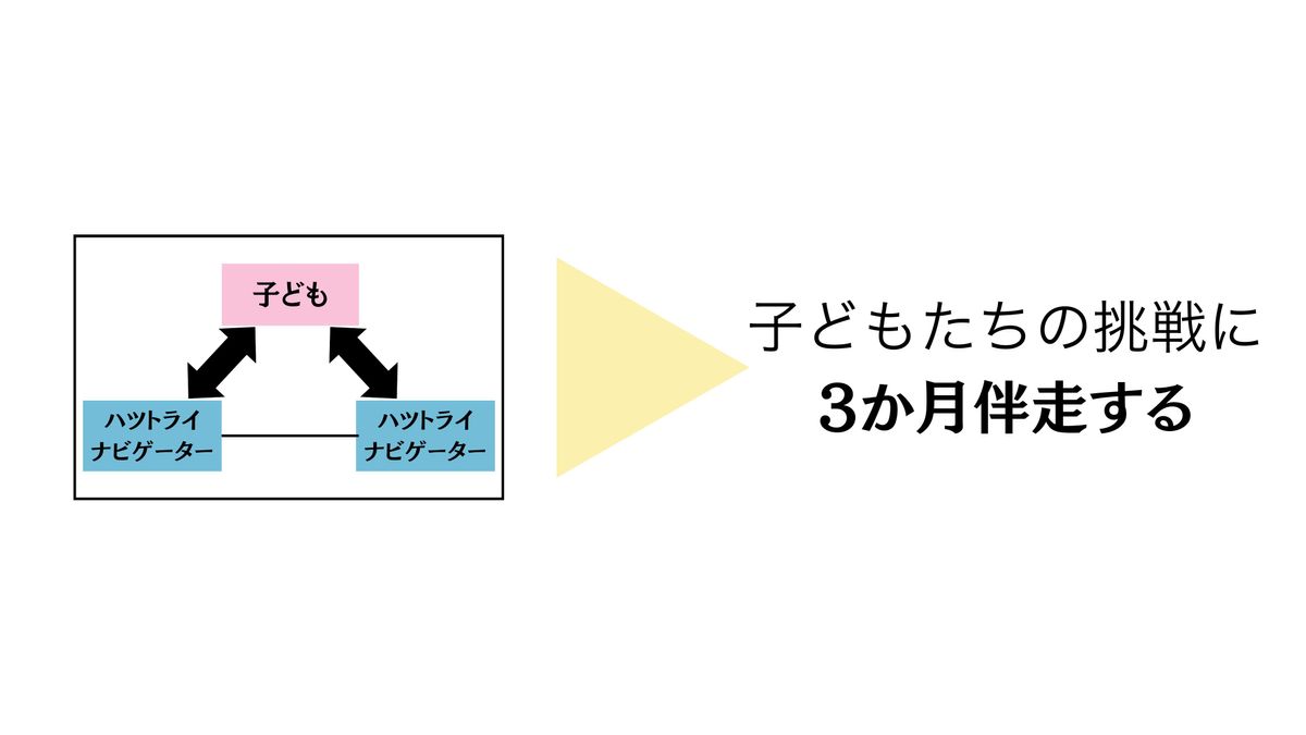 古川:子ども1人に対して「ハツトライナビゲーター」と呼ばれる大人が2人がつきます。3人でワンチーム。子どもたちの挑戦、やりたいこと、ハツトライの実行まで、3ヶ月の伴走を行う事業です。