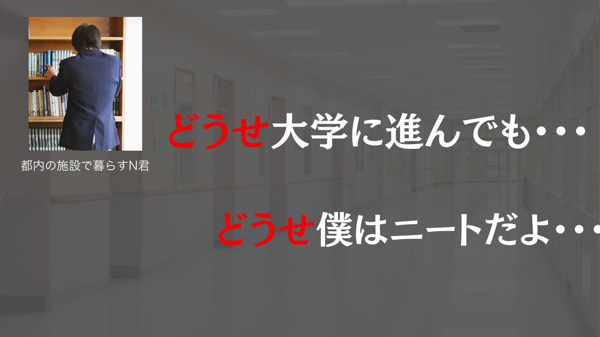 その中で出会った施設の子どもたちに感じた、ある1つの違和感。それは彼らが頻繁に口にする「どうせ」という言葉です。実際、僕が仲良くしている都内の施設のN君。彼はとても魅力的で頭もいい。何気なく聞いてみました。「将来どうするの?」