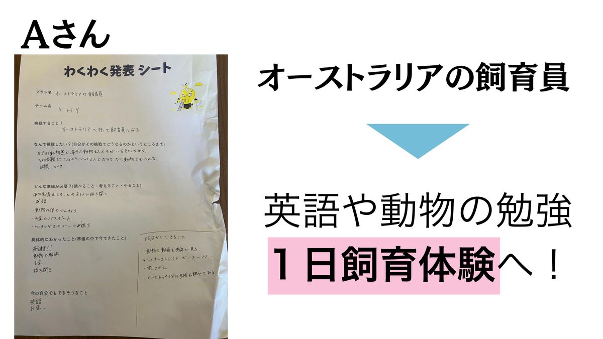 実際の例です。高校生のAさんはオーストラリアで飼育員になりたい。じゃあ、1ヶ月で英語や動物の勉強をしたり、1日飼育体験をやってみよう。2ヶ月目、1万円はどうする? 1ヶ月どうする? それを3人1組で一生懸命考えていく。そして実行(する)。