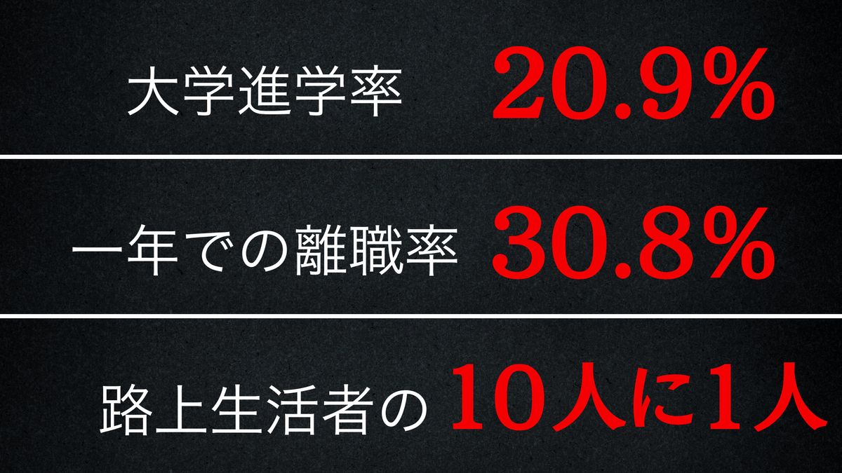 でも彼は言うんです。「どうせ大学に進んでも、どうせ僕はニートだよ」と。「え、なんで? 奨学金があるじゃん。職員さんのサポートもある」と言っても、実際全国的に見て、(施設出身者の)大学進学率は全国平均の約半分。1年での離職率30.8パーセント。路上生活者の10人に1人が施設出身者だと言われています。