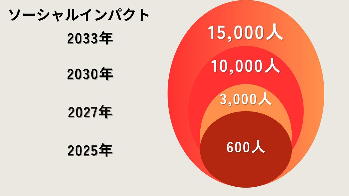 続いて、ソーシャルインパクトです。2025年には600人、そして2030年には1万人。今沖縄では1万5,000人の子どもたちが体験機会を得ることができないと言われています。2033年には1万5,000人すべての子どもたちに、体験を付与していこうと考えています。