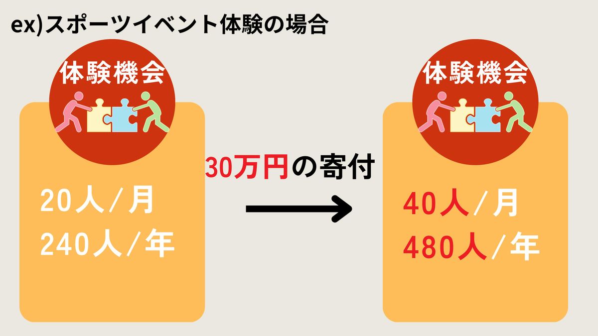 続いて中長期の効果測定です。体験機会を提供するNPOが30万円の寄付を受け取った場合、スポーツイベント体験の場合は30万円の寄付が年間あれば月に20人、そして年間240人の子どもたちが新しい体験を得ることができます。