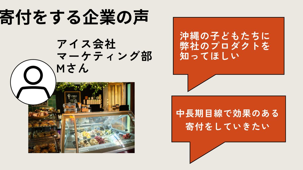 定久:実際に寄付してくれる企業さまの声です。「沖縄の子どもたちに弊社のプロダクトを知ってほしい」「中長期目線で効果のある寄付をしていきたい」。また「過去に寄付をしていたが、寄付が本当に効果があるのかわからず、検討後、結局寄付することをやめた」。このようなお話を聞きました。