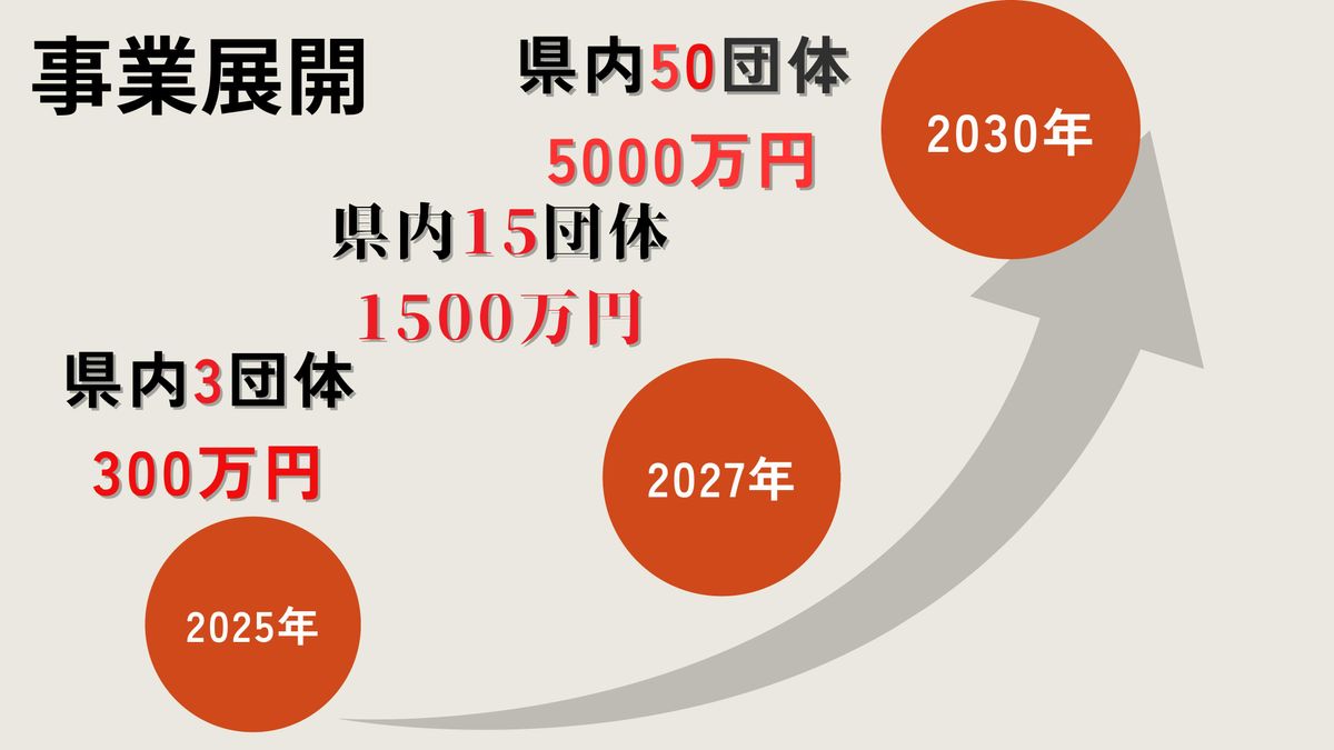 今後の事業展開です。まずは今年、3団体に300万円の寄付を促そうと考えています。そして2030年には県内50団体、5000万円の寄付を子ども支援に循環させていきます。
