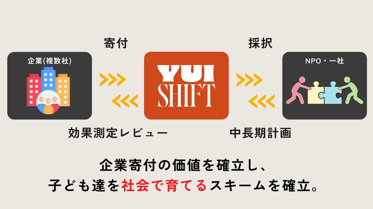 そこをアプローチするのが私たち「ゆいシフト」です。私たちは子ども支援の財団を設立します。企業とNPOのハブに入り、両者が担うべきリソースを私たちが担います。