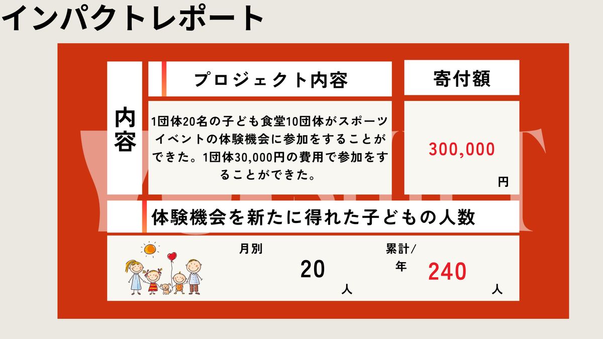 また寄付に対してどのような内容で、かつどのように使われたのか、そして何人の子どもたちに体験が提供できたのかを、インパクトレポートという形で可視化していきます。