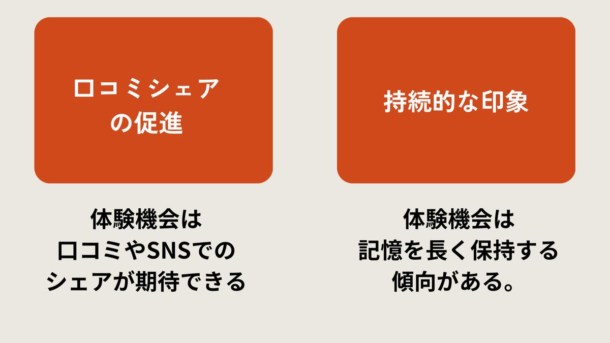 口コミシェアの促進や持続的な印象等。みなさんも過去を振り返ってもらえるとわかると思いますが、何かの体験をすると、それが非常に頭の中に残っていると思います。中長期で子どもと企業が接点を取ることができます。