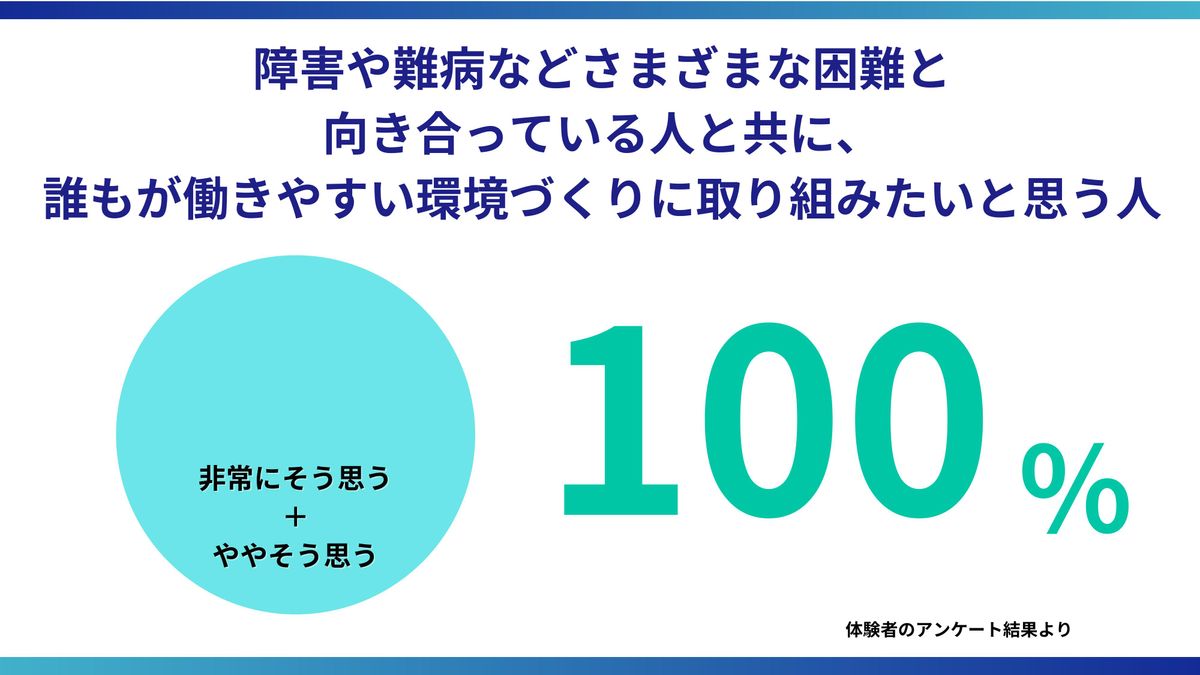 竹田:ベータ版検証の効果です。20代の男女38名に実際に体験していただきました。その中で、「視覚障害に関する自分の中の誤解や偏見に気づいた」と思う人が90.9パーセント。「障害や難病などさまざまな困難と向き合っている人とともに、誰もが働きやすい環境を作りたい」と思う人が100パーセント。「障害や難病などさまざまな困難と向き合っている人が社会で活躍する姿をより想像しやすくなった」(と感じる)人が96.9パーセントいらっしゃいました。