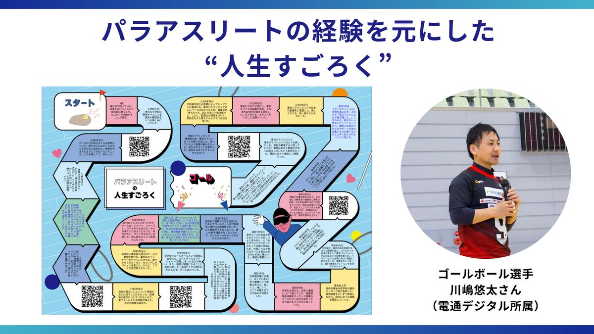 そのツールとして、ゴールボール選手の川島悠太さん(電通デジタル所属)とパラアスリートの経験をもとにした人生すごろくを作成しました。障害の話はセンシティブで、踏み込みにくいことが課題としてあります。すごろくを体験しながら、気軽に知ることができることで、対話のきっかけを生み出します。