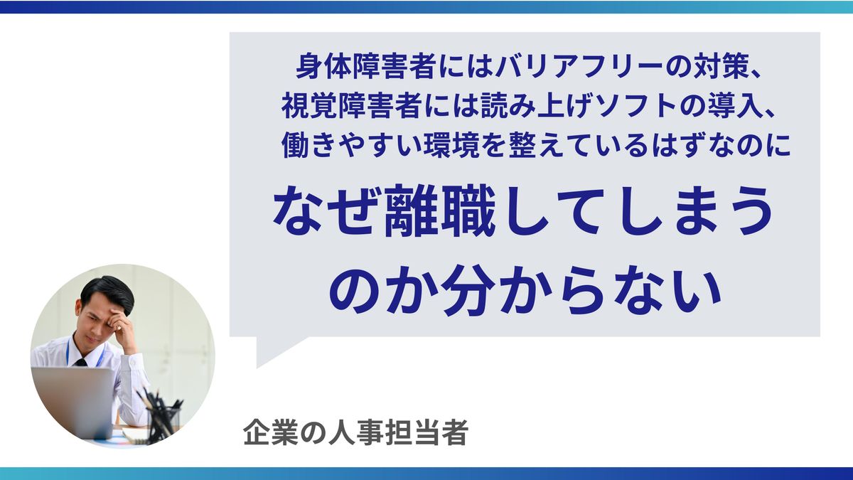 人事担当者のインサイトです。「障害者に対して、こんなにもバリアフリーで働きやすい環境を整えているはずなのに、なぜ離職してしまうのかわからない」。だけど、ある身体障害者のNさんからの話を聞いてみると、すごく共感できるんです。「環境は整っているけど、自分の障害特性を理解してくれる人が周囲に少ない」「すべてのことに配慮をされて、自分で責任を持てる仕事が1つもない」。