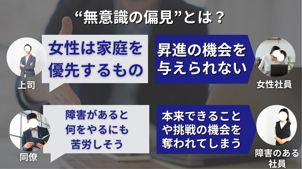 無意識の偏見とは、例えば「女性は家庭を優先するもの」という固定観念を持った上司によって、昇進の機会を与えられない女性社員がいる。「障害があると何をやるにも苦労しそう」という先入観を持った同僚によって、本来できることや挑戦の機会を奪われてしまう、障害のある社員がいる。
