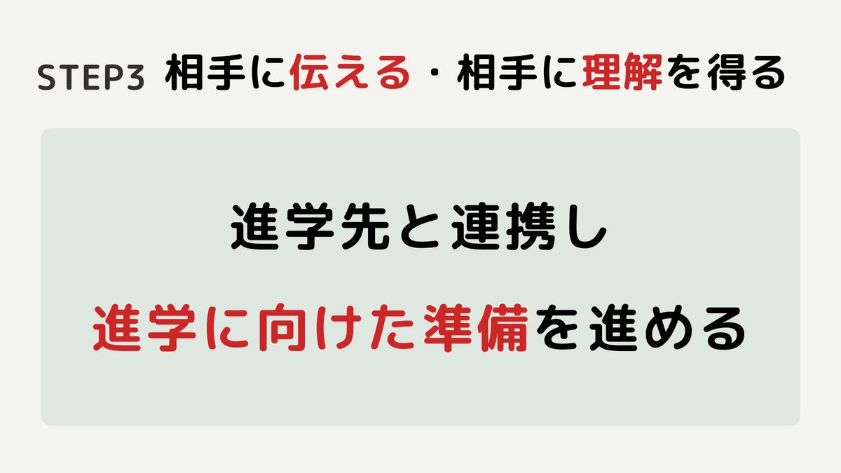 最後に進学に向けた準備。自分の特性だったり困りごと、さらには次の進学先、高校、大学の先生たちに、この情報を共有することで、事前にグレーゾーンの子どもたちが進学する前に不安を解消できます。