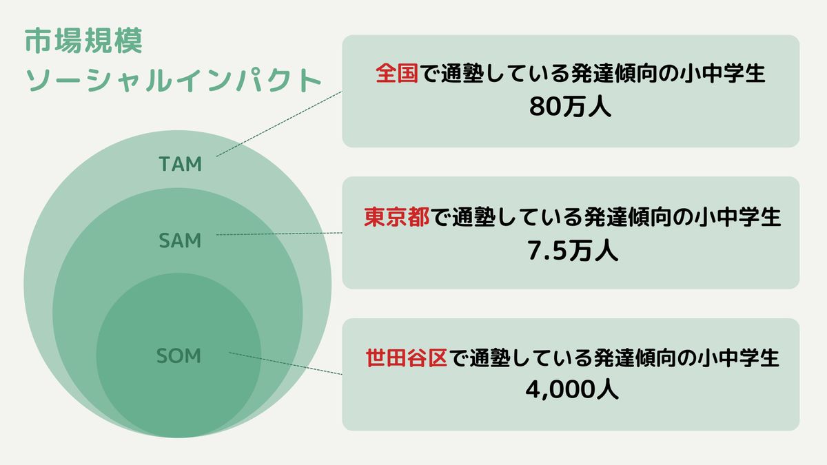 東京都から全国80万人いる発達障害グレーゾーンの子どもへアプローチしていく。特にこの発達課題を持った子は地方にたくさんいます。しかしながら発達特性へのサービスは、地方にはなかなか展開しづらいです。私たちは家庭教師サービスという特性を活かして、講師がどこにでもいる環境を作り、さらには地方に届けていきたいと考えています。